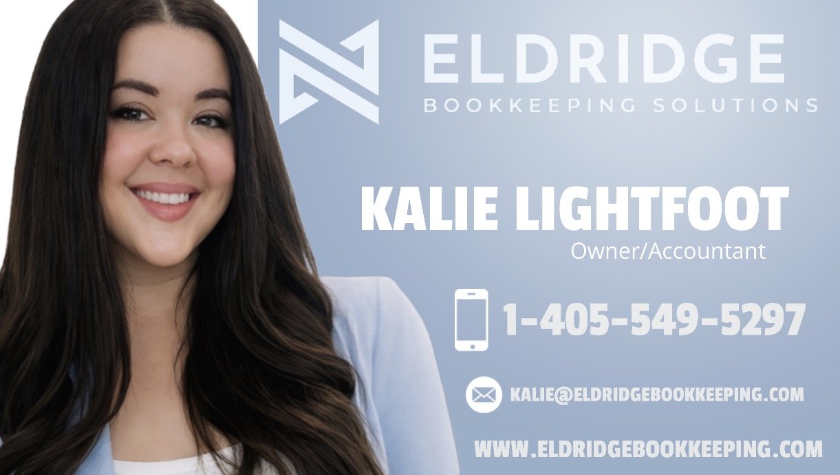 A woman with long dark hair smiling at the camera, wearing a light blue blazer and white top, standing against a neutral background with a logo that reads Eldridge Bookkeeping Solutions in the bottom right corner.